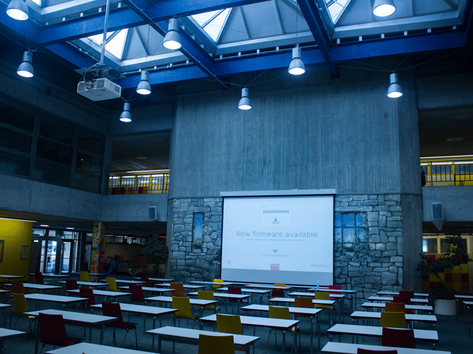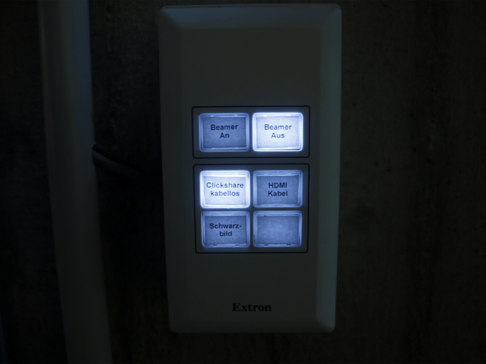 Zusätzlich wurde auf Kundenwunsch ein Regen- / Kondenswasserschutz von uns konzipiert und am Projektor montiert. Die Steuerung der elektrischen Stumpfl Leinwand und des Beamers erfolgt über ein vandalismussicheres Extron Tastenfeld, welches fest an der Wand montiert und über einen Schlüsselschalter abschaltbar ist. Neben einem HDMI Wandanschluss ist auch eine kabellose Bild- und Tonübertragung von Windows & Apple Laptops oder Android & iOS Tablets möglich.