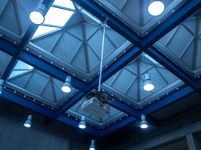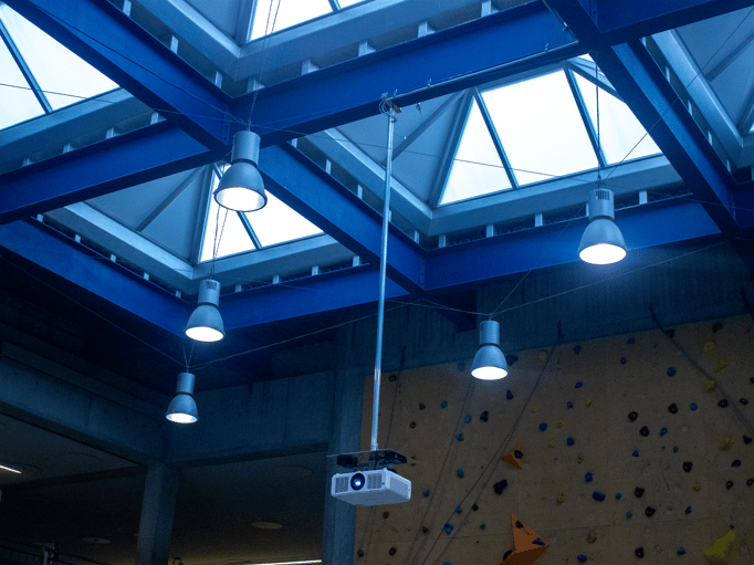 Der hochwertige und lichtstarke Laserprojektor mit individuell angepasster Optik wurde mit einer 4 Meter langen Sonderkonstruktion am T-Träger der Decke angebracht. Die Kabelführung erfolgt nahezu unsichtbar innerhalb der hierfür angebrachten Rohre.