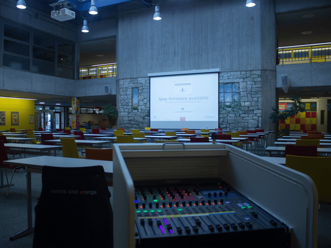 Die Theodor-Schüz Realschule Herrenberg beauftragte EMT Event Media Tec die Audio- und Medientechnik für den "Markt" (Aula) zu konzipieren und umsetzen. Um eine flächendeckende Beschallung des "Markts" zu erreichen, realisierte EMT dies mittels 4 Mittelhochton-Lautsprecher und 2 Subwoofer des Herstellers Fohhn. Durch die weißgraue Lackierung integrieren sich die Lautsprecher hervorragend in die bestehende Architektur.