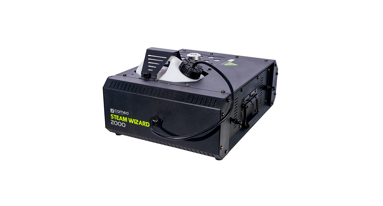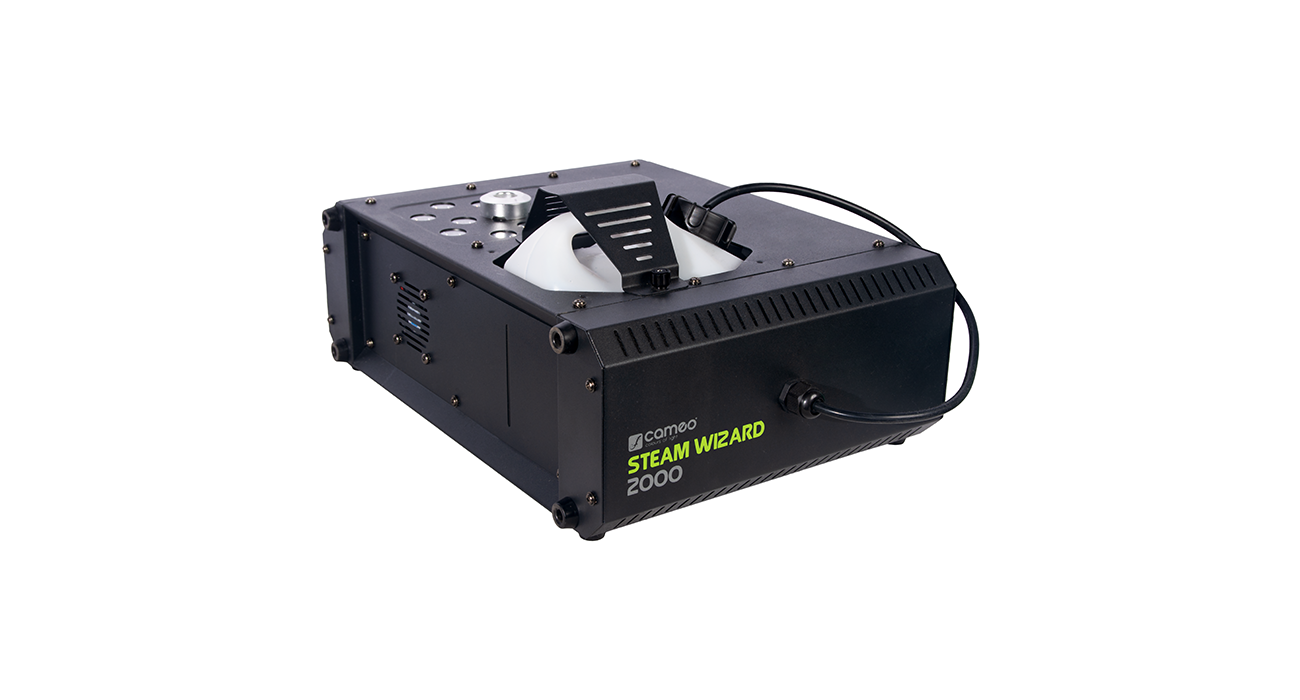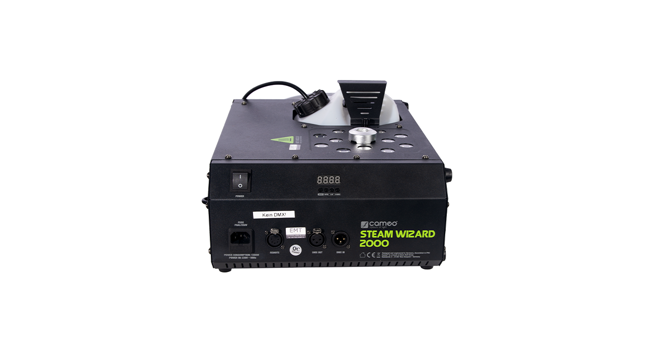 1.200 W Heizelement und Hochleistungspumpe für kraftvolle Nebelfontänen, 12 x 10W RGBA 4-in-1 LEDs zur gleichmäßigen Ausleuchtung des Nebels, Senkrechter oder waagerechter Nebelausstoß, Tankeinschub auf Ober- oder Unterseite wählbar, dadurch leichte Überkopfmontage zum Ausstoß nach unten, DMX-Steuerung im 4-Kanal-Modus, Inklusive Fernbedienung mit 10 m Anschlusskabel und beleuchteten Tasten und Reglern für Continous, Timer, Manual, Nebelausstoß, LED-Helligkeit und Farbe